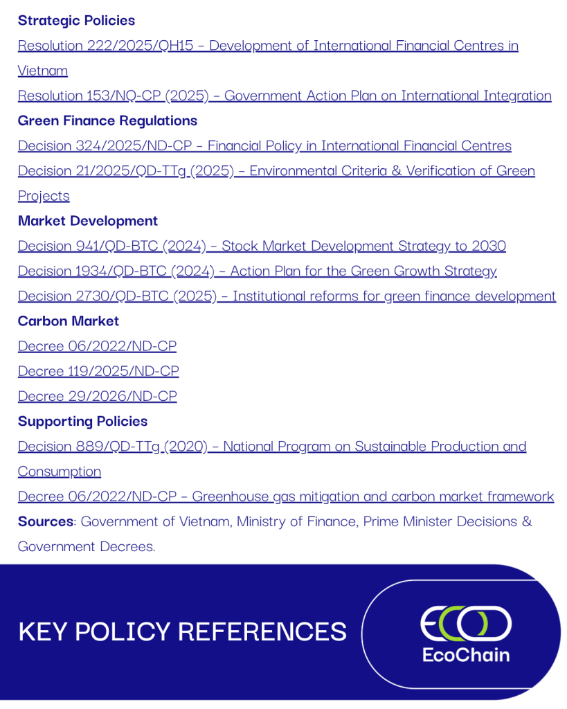 Swipe through the carousel for a quick overview of the key regulations shaping Vietnam’s green finance ecosystem.