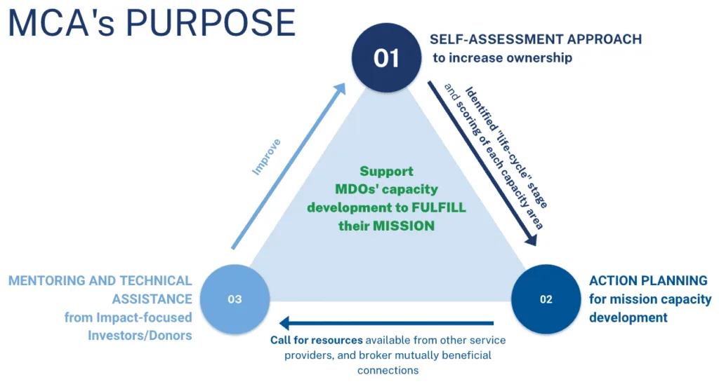 The MCA toolkit is designed for organizations committed to solving social and environmental issues while balancing economic profitability. It enables these organizations to self-assess their development capacities, fostering ownership of action plans aimed at capacity improvement.